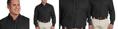 100% cotton denim; Inside, flat-felled seams; Khaki double-needle topstitching; Left-chest pocket and signature twill tape at neck; Fully constructed front placket with button-down collar; Signature horn-style buttons with Harriton logo; Buttons use contrast thread;