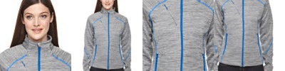 bonded with 100% polyester microfleece, 7.4 oz./yd2/; 100% polyester mélange jersey; inside storm placket with chin guard; contrast center front reverse coil zipper ; stretch storm cuffs with thumb holes; chest pocket with contrast invisible zipper; lower pockets with contrast reverse coil zippers; contrast coverstitch details; audio port access through inside left pocket; adjustable shockcord at hem;