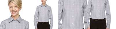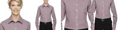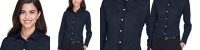 3.4 oz., 55% cotton, 45% polyester; Fine yarn count shirting; True Non-iron performance straight from the dryer; stain release finish; Active Fit; Patented pucker-free taped seams; Fused collar, cuffs, and placket; Split back seam with bias cut back yoke; straight collar; pearlized buttons; front and back princess seams for a flattering feminine fit; bust darts for a flattering feminine fit;