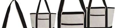 12 oz cotton canvas; Interior zippered pocket 6.5" W x 7.25" H; Exterior front pocket 8.5" W x 9" H; 28" handles with 10" drop; 22" x 16" x 6";