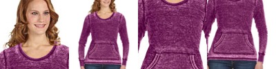 8 oz., stretch & sueded triblend terry; 51% rayon, 43% polyester, 6% elastine; 4-way stretch fabric withstriped loop back yarns; Advanced raglan sleeves with underarm gussets; Wrap back panel & front pouch pocket;