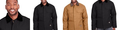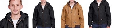 10 oz., super-duty 100% cotton duck; Medium-weight quilt lined taffeta; Water-repellent finish; Full-length heavy-duty brass zipper; Triple-needle stitched main seams; Double inside chest pockets; Insulated "High Back" design;