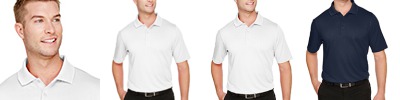 5 oz./yd2 / 172 gsm, 100% polyester face plaited to 60% polyester, 40% cotton back (total overall garment 61% polyester, 39% cotton); Proprietary dual-sided mesh pique knit constructed of fine denier wicking polyester on the outside and soft-as-cotton wicking blend on the inside; Moisture-wicking performance with UV 15-39 protection; Three-button placket; Dyed-to-match buttons; Matching flat-knit collar with contrast double tipping; Side vents; Active fit; Easy care;