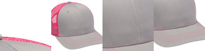 100% brushed cotton, mid-weight twill crown & visor; Soft mesh back panels; Charcoal grey front panels & visor with contrast color back mesh panels; Matching color sewn eyelets and grey top button; 6-panel, structure, midprofile; Grey plastic snap back closure; Semi-flat visor;