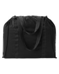 100% polyester canvas; 100% cotton sheeting lining w/ patch pocket; 25" natural rope handles with metal grommet attachments ; Magnetic snap closure; 15"W oval base; 15"W x 15.5"H x 11"D;