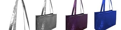 90 gram heavyweight polypropylene with metallic coating; recyclable; self fabric handles measuring 24” with a drop handle length of 11”; 14” L x 15” H;