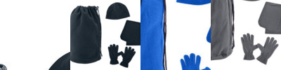 - Drawcord pouch packed with matching fleece hat, gloves and scarf