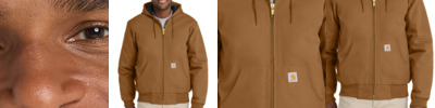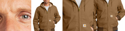 Whether you're on a land survey or construction road crew, this hooded jacket is designed to keep you comfortable when the weather is iffy. 12-ounce, firm hand, 100% ring spun cotton duck canvas Wind Fighter ® technology tames wind 100% polyester thermal lining Attached thermal-lined three-piece hood with drawcord closure Full-length brass front zipper Two interior pockets: one zippered, one hook and loop Two large lower-front pockets Rib knit cuffs and waistband Carhartt-strong, triple-stitched main seams Carhartt label sewn on left pocket Carhartt Warmth Rating Earned: Level 1â¿¿Warm Loose fit