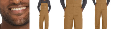 12-ounce, firm hand, 100% ring spun cotton duck canvas Quilted nylon lining to waist for easy on and off; 100% polyester insulation to waist for midweight warmth Adjustable elastic suspenders Multi-compartment bib pocket with zip closure Zipper fly Two large front pockets Hammer loop on right leg Seam-to-seam chap-style double-front construction Double-layer knees with openings for added knee pads and cleaning out debris Ankle-to-thigh leg zippers with storm flaps and snap closures Reinforced Cordura ® back-leg kick panels Two reinforced back pockets Metal rivets at vital stress points Carhartt-strong, triple-stitched main seams Carhartt label sewn on bib pocket 31-inch inseam Loose fit