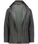 * 100% breathable polyester with DWR and PU coating * Shell fabric features 9,000MM fabric waterproof rating 2,000G/M2 fabric breathability rating * Stain resistant * Heat sealed label * High collar, full-zip with hook-and-loop neck closure * Hood with inside adjustable shockcord closure * Sealed seams for protection from rain * Raglan sleeves * Front zippered pockets with waterproof coating * Open bottom with snap closure * Dropped tail bottom * Water-resistant * Waterproof
